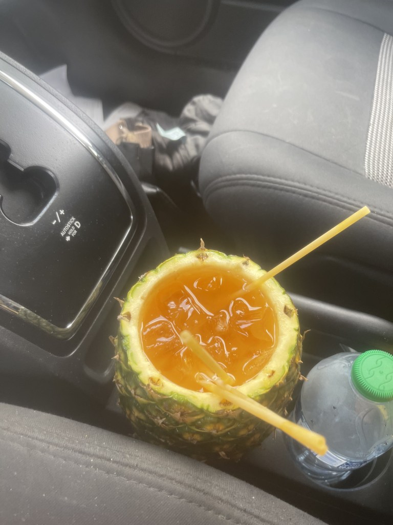 Now, if you are a vodka connoisseur, like I, you are SOL. They have Absolute. And that’s absolutely it (no pun intended). They’ll have a couple Tequila’s – typically no silvers. But man, there’s rum selections for days and it is freaking delicious!! Or maybe they just water it down, idk. But I got this drink made in a pineapple (with noodle straws lol) that I literally watched him pour 3/4 of the way up with rum and splashed some juice in – and it tasted like heaven. I even ordered one to go! 😊